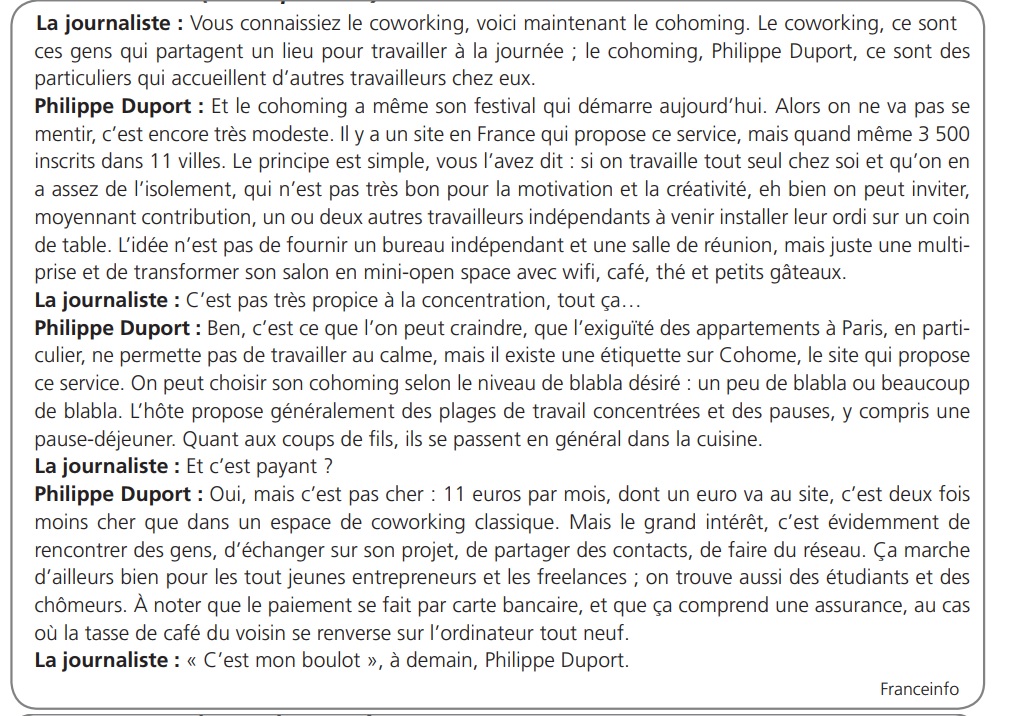 - D’après moi, le cohoming c’est un espace personnel partagé avec d’autres personnes pour travailler ensemble. Peut-être c’est une organisation où une personne met à disposition